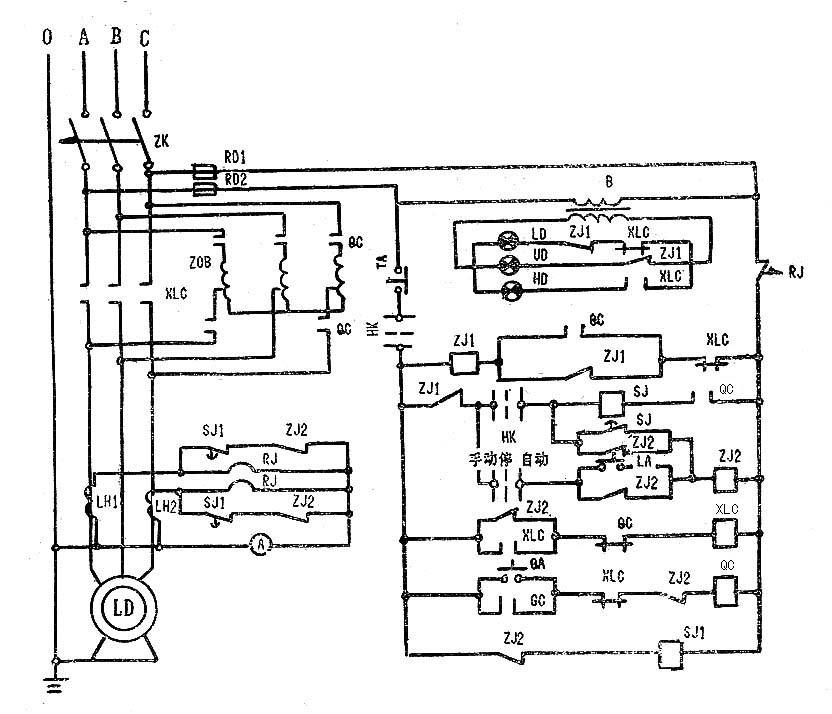 將組合開關置于自動方式位置,按下QA,QC吸合并自鎖,SJ得電,同時ZJ1得電自鎖,待到整定時間后SJ1的常開延時接點閉合,ZJ2得電動作,此時XLC得電動作,整個起動過程完成。ZJ1、ZJ2、SJ均斷電,只有XLC、SJ1通電。這樣既防止了電動機直接起動的可能,同時又延長了中間繼電器的壽命,并且ZJ1、ZJ2、SJ在全壓運行時,不再消耗能量。尤其是在起動中,如果由于種種原因ZJ2不動作,那么SJ1得電,SJ1串于電流互感器保護回路中的常閉延時接點在延遲一定時間(此時間大于SJ的整定時間)后斷開,熱繼電器RJ起過流保護作用。這樣與進線空氣開關形成對過電流起動的雙重保護。